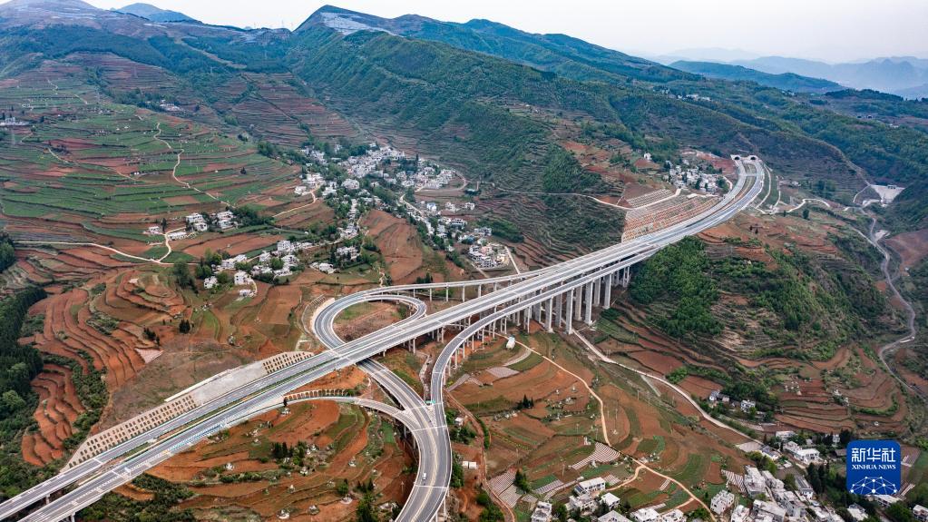 貴州赫(赫章)六(六盤(pán)水)高速公路汪家寨互通(4月21日攝,無(wú)人機照片)。新華社記者 陶亮 攝