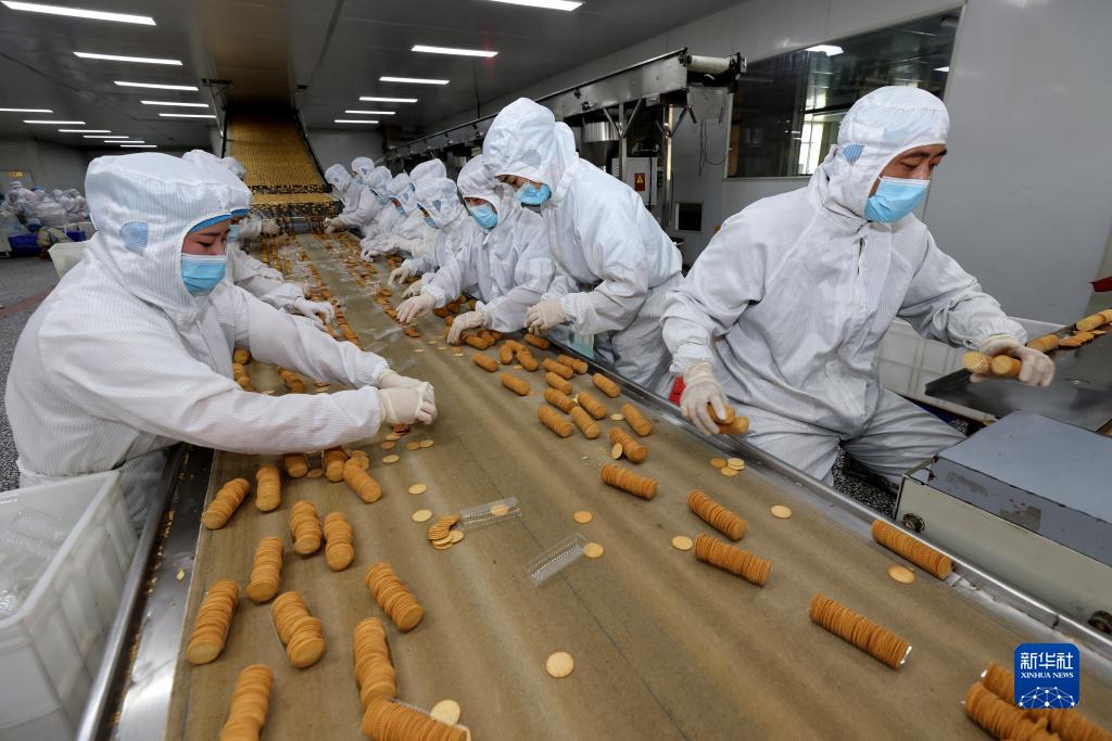 4月30日,山東省棗莊市孟莊鎮一家食品企業(yè)的工人在包裝餅干。新華社發(fā)(孫中喆 攝)