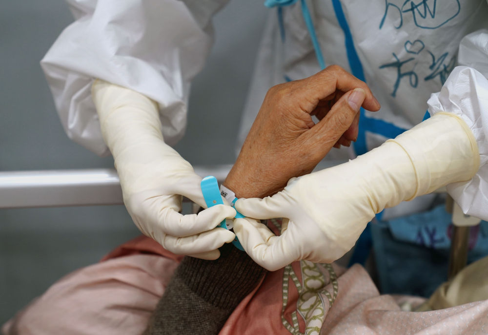 ↑4月23日,上海臨港方艙醫院的醫護人員幫助老年患者佩戴腕帶。