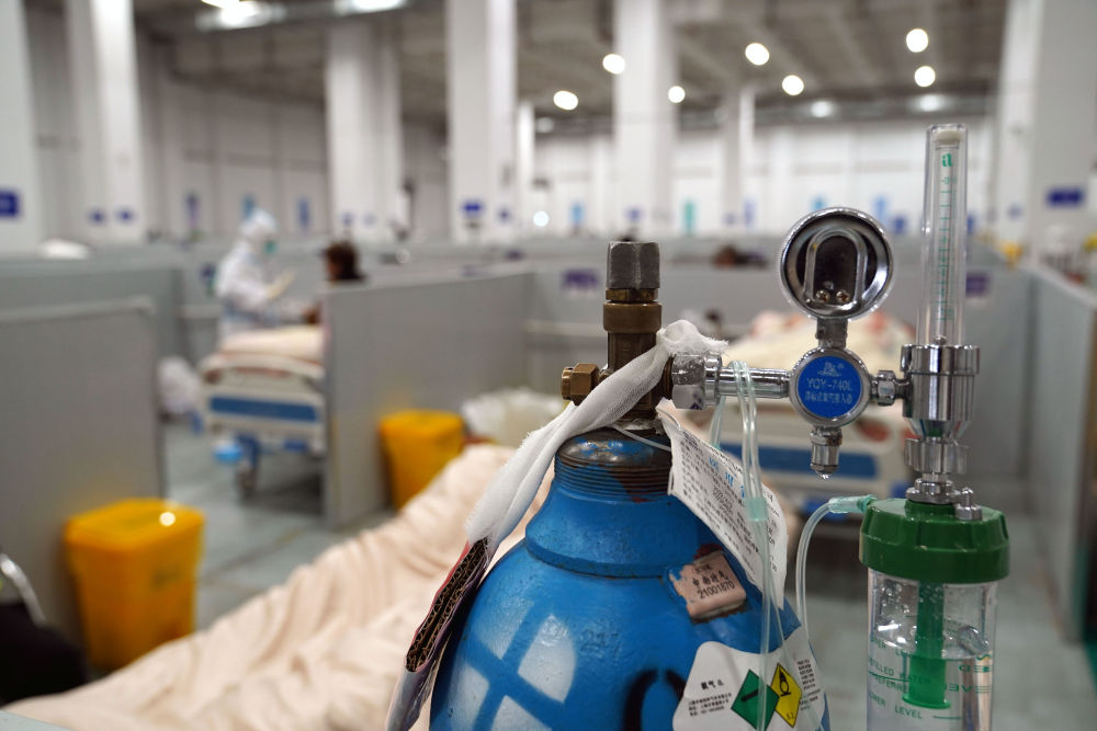 ↑4月23日在上海臨港方艙醫院拍攝的升級改造床位配備的氧氣瓶。