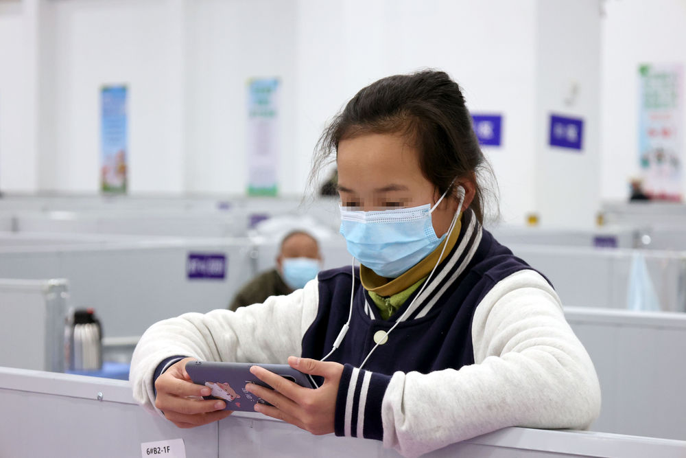 ↑4月19日,上海臨港方艙醫院,一名學(xué)生感染者通過(guò)手機上網(wǎng)課。
