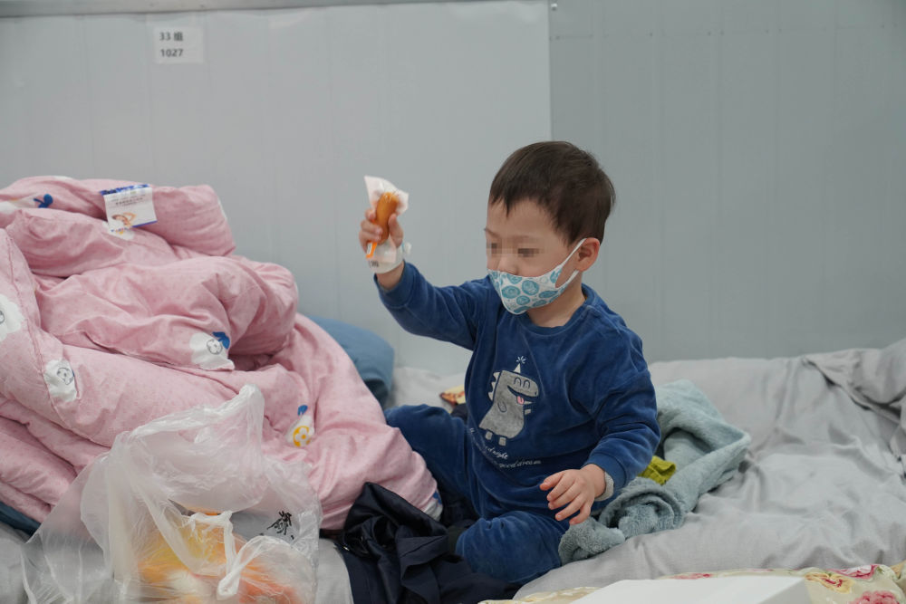 ↑4月25日,一名兒童患者在方艙醫院內玩耍。