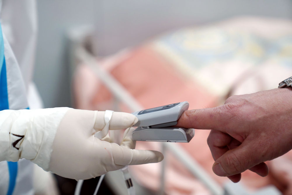 ↑4月21日,臨港方艙醫院的醫護人員幫患者測量血氧飽和度。