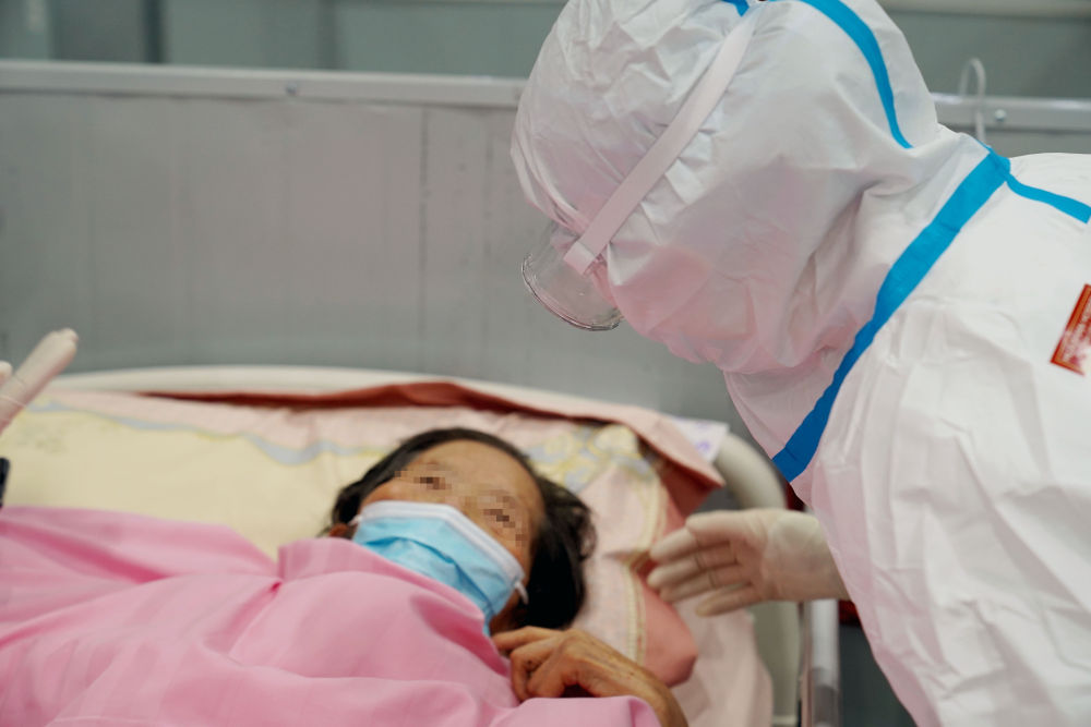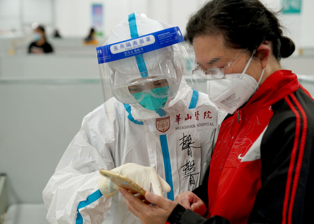 ↑4月23日,上海臨港方艙醫院的醫護人員與老年患者交流。