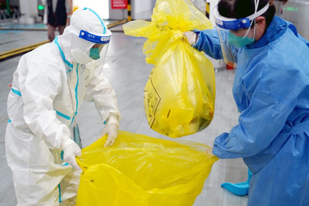 ↑4月28日,在臨港方艙醫院,一名保潔員和一名志愿者在清運生活垃圾。