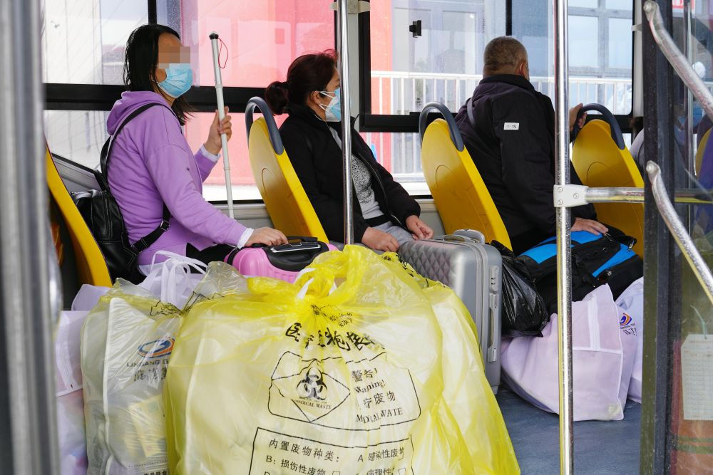 ↑4月30日,康復出艙人員離開(kāi)上海臨港方艙醫院,乘坐轉運車(chē)輛返回居住地接受健康監測。