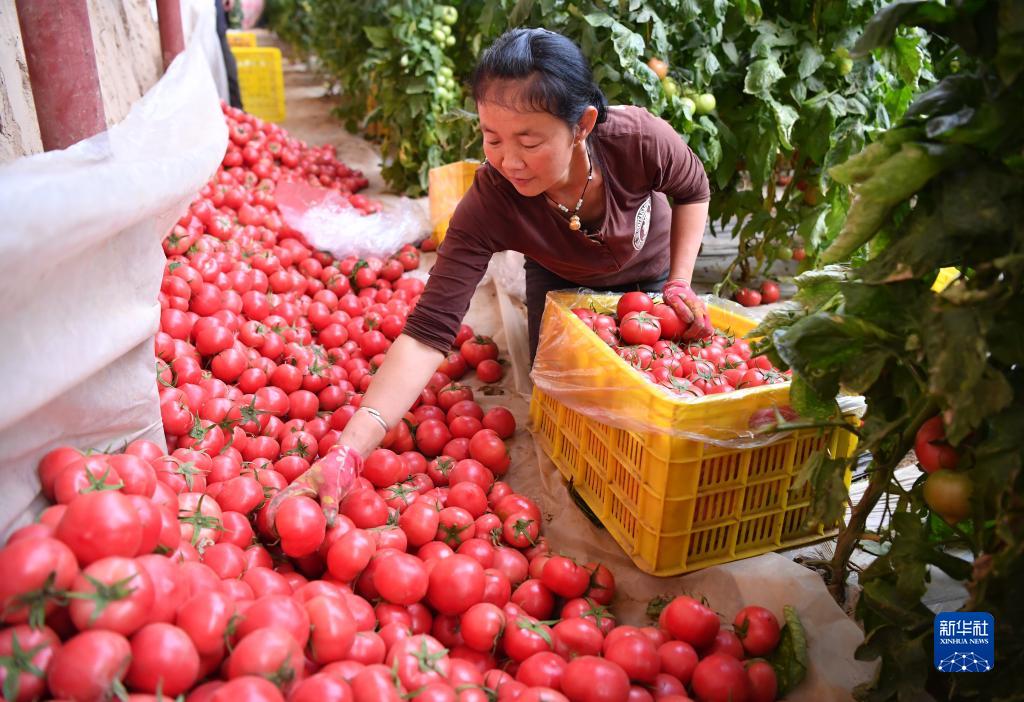 延安市安塞區化子坪鎮張岔村村民在大棚內采收西紅柿(3月29日攝)。新華社記者 邵瑞 攝
