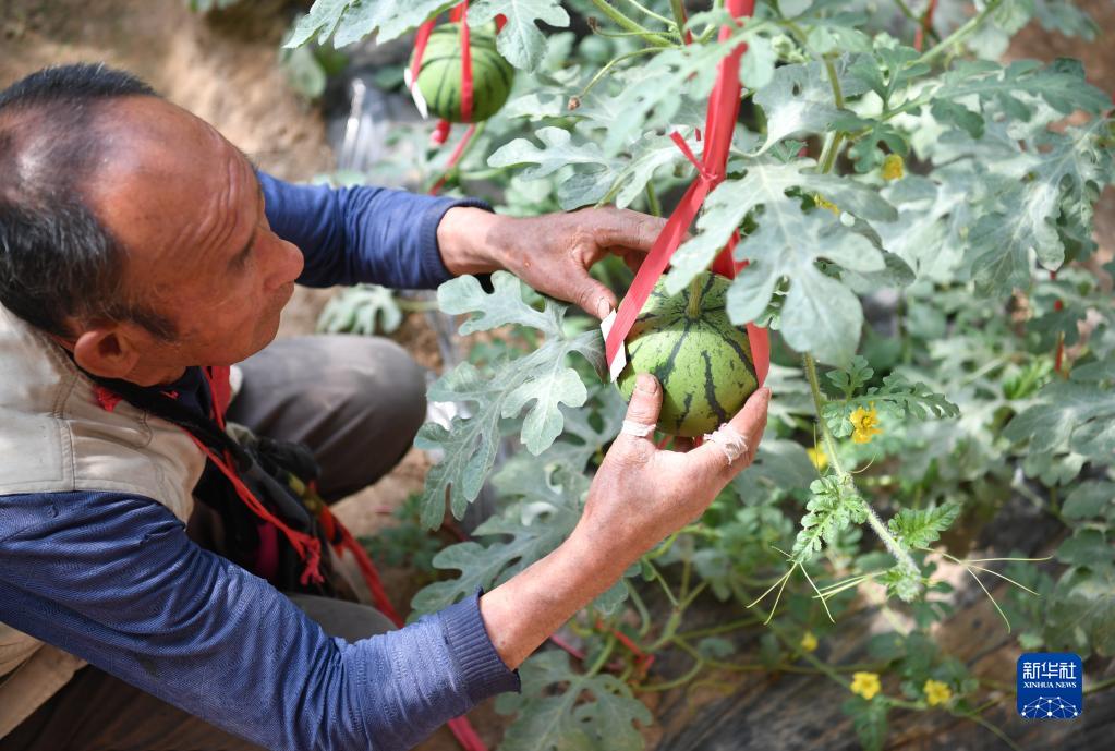 延安市延川縣關(guān)莊鎮二八甲村村民在大棚內查看西瓜的“生日卡”(3月31日攝)。新華社記者 邵瑞 攝