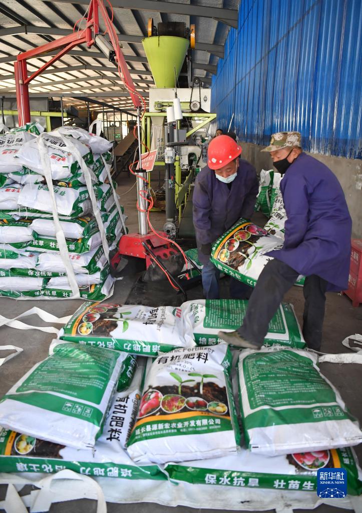 在延安市延長(cháng)縣現代循環(huán)農業(yè)示范園一家企業(yè)車(chē)間內,工人在搬運有機肥料(4月1日攝)。新華社記者 邵瑞 攝