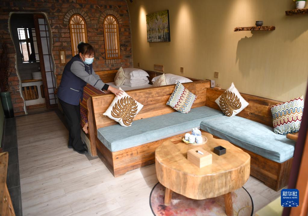 服務(wù)員在延安市寶塔區河莊坪鎮趙家岸村一家民宿內整理房間(3月30日攝)。新華社記者 邵瑞 攝