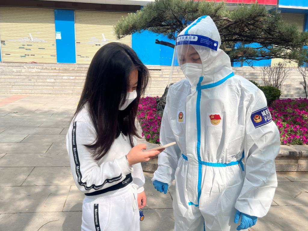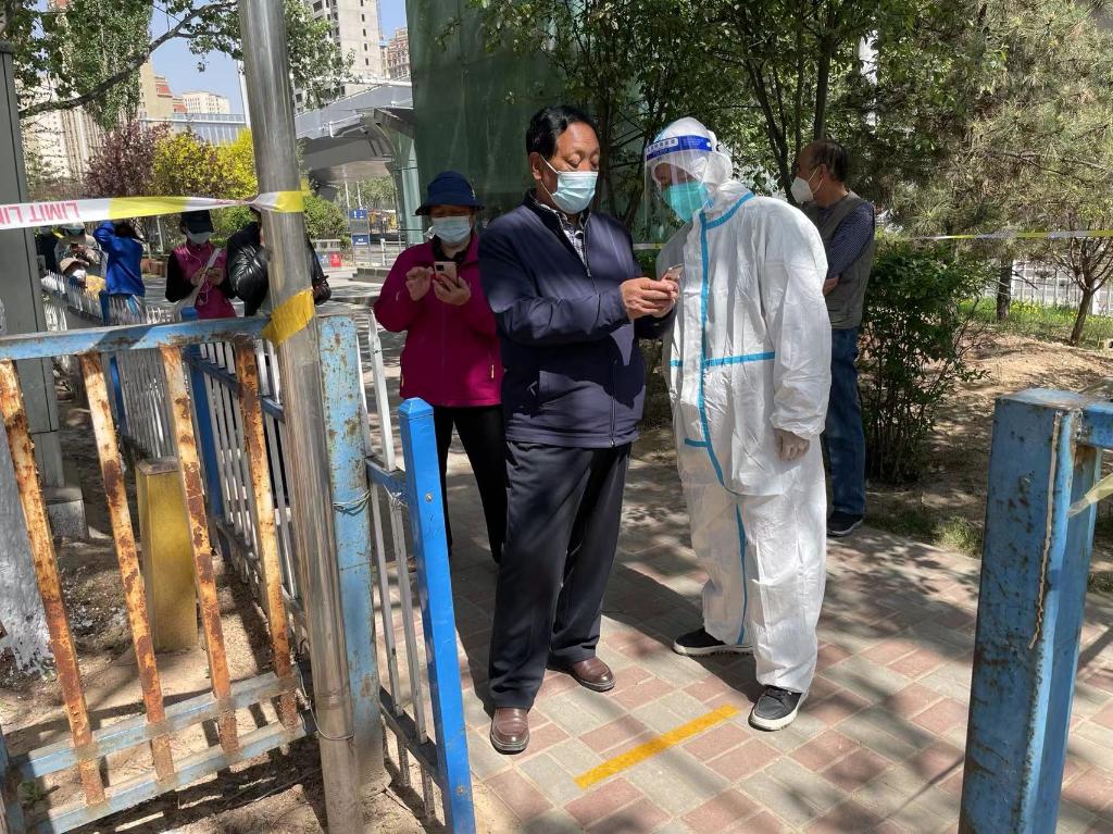 5月8日,許生明在西寧市城西區行知公園核酸檢測點(diǎn)查驗市民的健康碼和行程碼。(受訪(fǎng)者供圖)