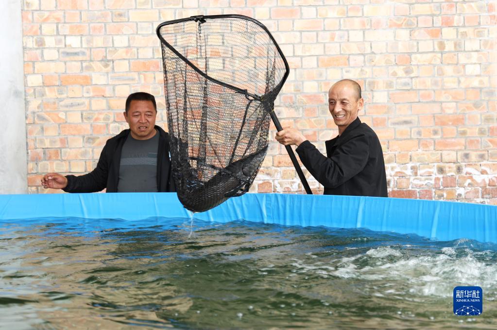 寧夏固原市原州區姚磨村種植大戶(hù)姚選(右)在“種養結合”大棚里撈魚(yú)(4月19日攝)。新華社記者 盧鷹 攝