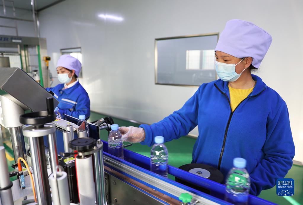 寧夏固原市涇源縣騰筠源飲品有限公司的工人在飲用水生產(chǎn)線(xiàn)上工作(4月20日攝)。該公司獲得用水權確權1.97萬(wàn)方,以水定產(chǎn)的約束讓公司時(shí)刻緊繃節約用水意識。新華社記者 盧鷹 攝