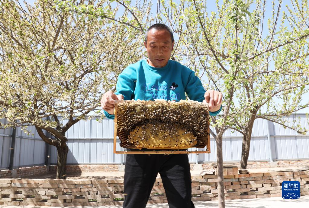 寧夏固原市彭陽(yáng)縣米塬村蜂農米克宗在觀(guān)察自家養殖的蜜蜂(4月20日攝)。新華社記者 盧鷹 攝