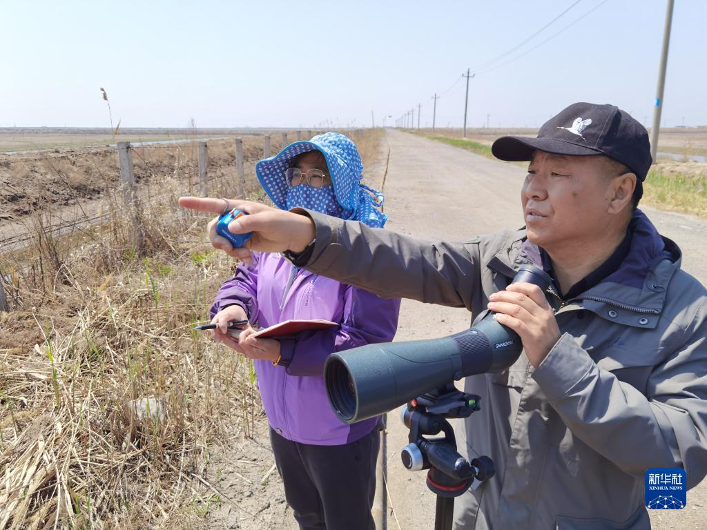 4月29日,盤(pán)錦市林業(yè)和濕地保護服務(wù)中心主任李玉祥(右)和同事在觀(guān)察黑嘴鷗數量。新華社發(fā)