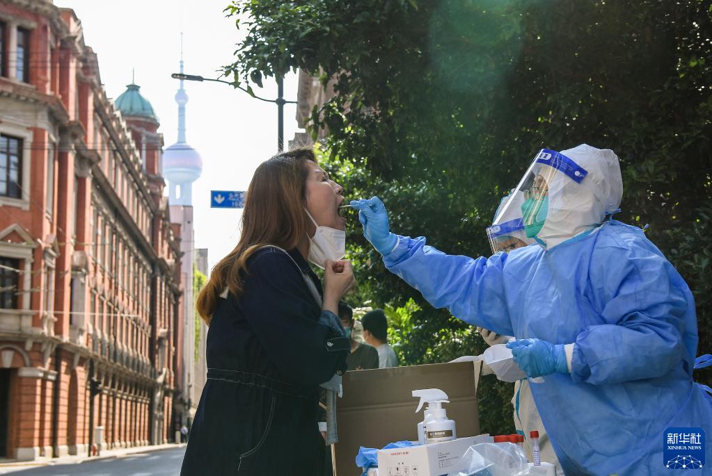 居民在上海市黃浦區核酸篩查點(diǎn)接受采樣(5月7日攝)。新華社記者 李賀 攝