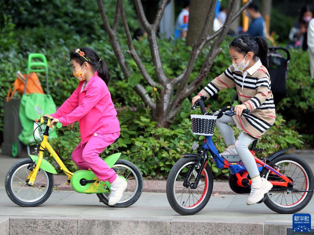 5月17日,在上海市松江區,小朋友們在騎自行車(chē)。新華社記者 劉穎 攝