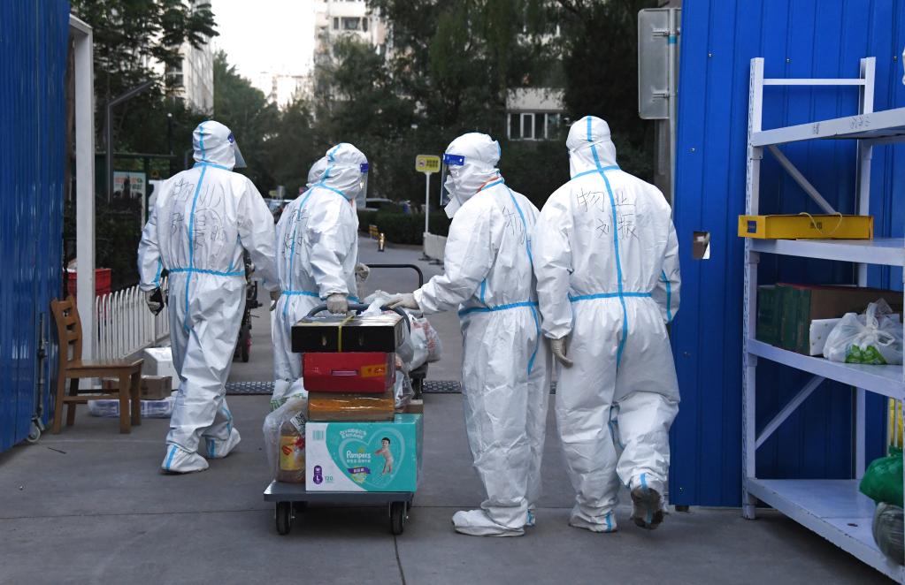 5月15日,在北京市海淀區中關(guān)村街道三才堂水清木華園小區設置的緩沖區,工作人員準備為小區居民運送訂購的物資。(新華社記者任超 攝)