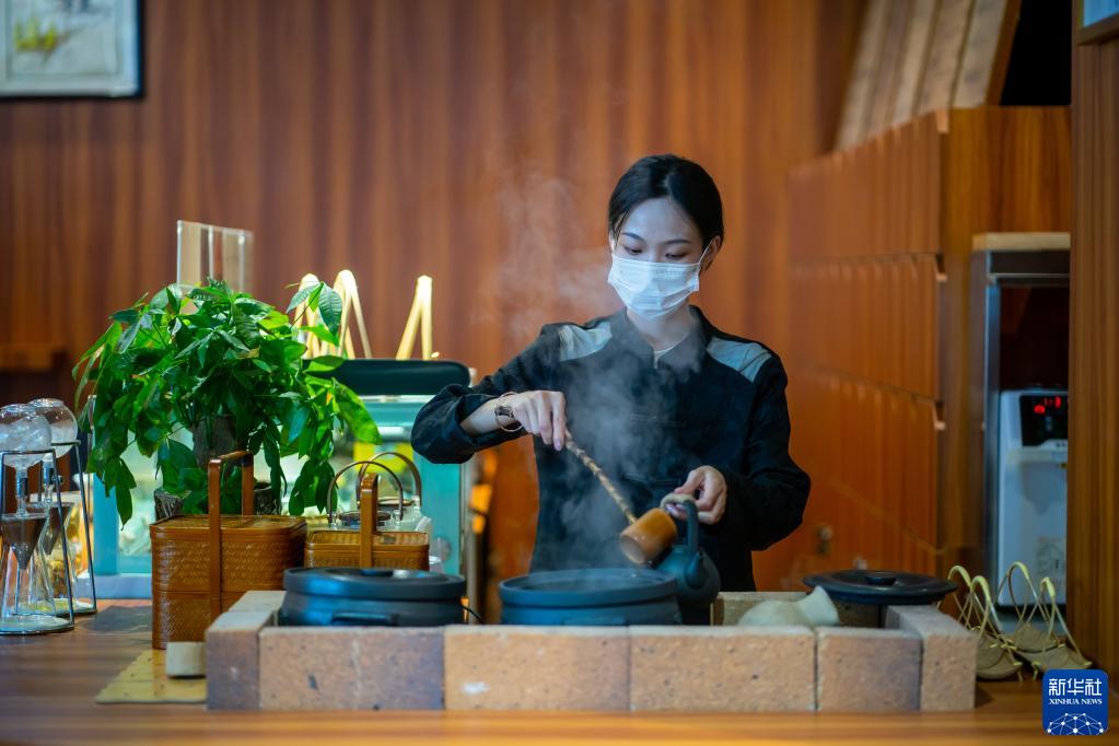云南勐海大益茶庭的茶藝師陳夷在制作冰滴普洱茶(5月10日攝)。新華社記者江文耀攝