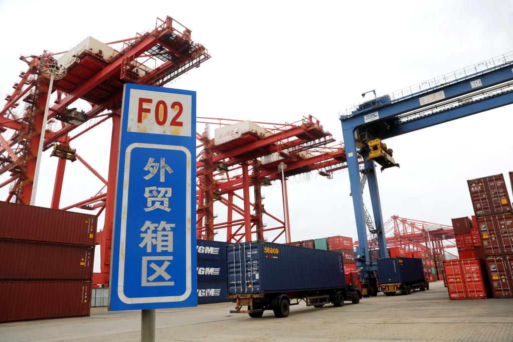 5月9日,在江蘇省連云港港集裝箱碼頭,運輸車(chē)輛向貨輪轉運集裝箱。新華社發(fā)(王春攝)