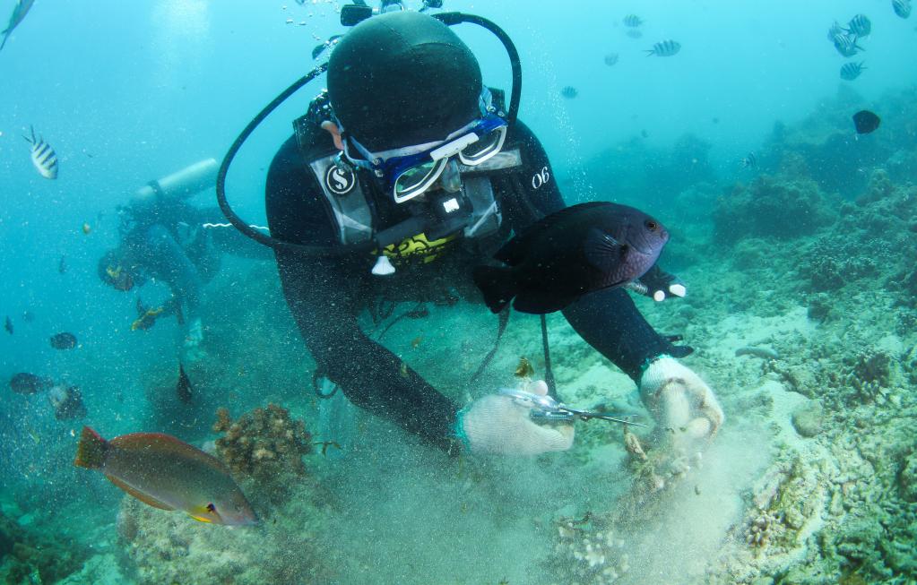 在海南三亞蜈支洲島海域,工作人員在海底清理垃圾。新華社記者楊冠宇 攝