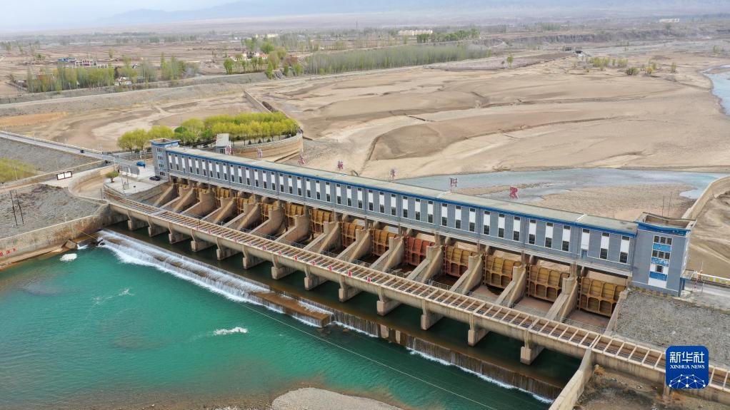 這是在黑河上游的草灘莊引水樞紐(4月13日攝,無(wú)人機照片)。新華社記者 陳斌 攝