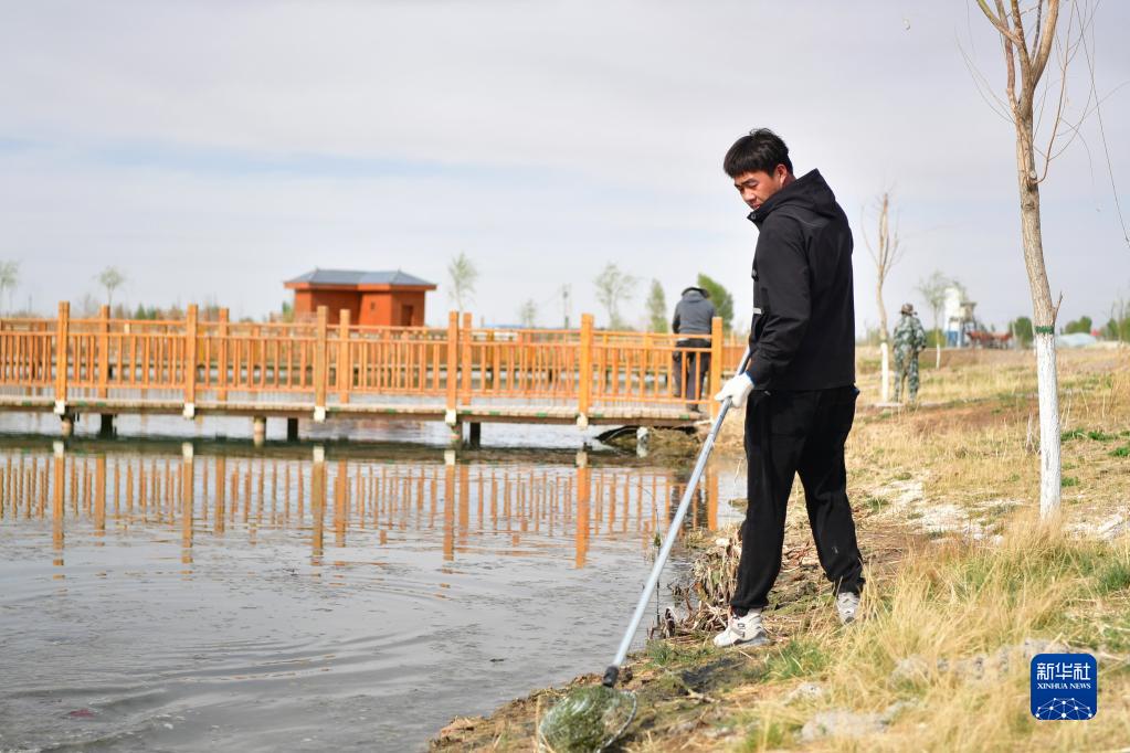 村民在甘肅省張掖市臨澤縣鴨暖鎮白寨村的湖邊清理環(huán)境(4月14日攝)。新華社記者 陳斌 攝