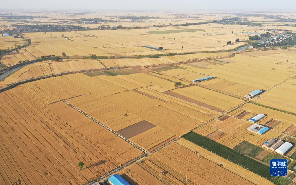 6月7日,在山東省惠民縣桑落墅鎮,農民駕駛農機收獲小麥(無(wú)人機照片)。新華社記者 郭緒雷 攝