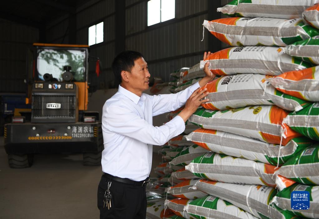 5月26日,在河南省南陽(yáng)市唐河縣湖陽(yáng)鎮張灣村,種糧大戶(hù)趙建成在整理倉庫里的化肥,準備夏收之后的夏種。新華社記者 張浩然 攝
