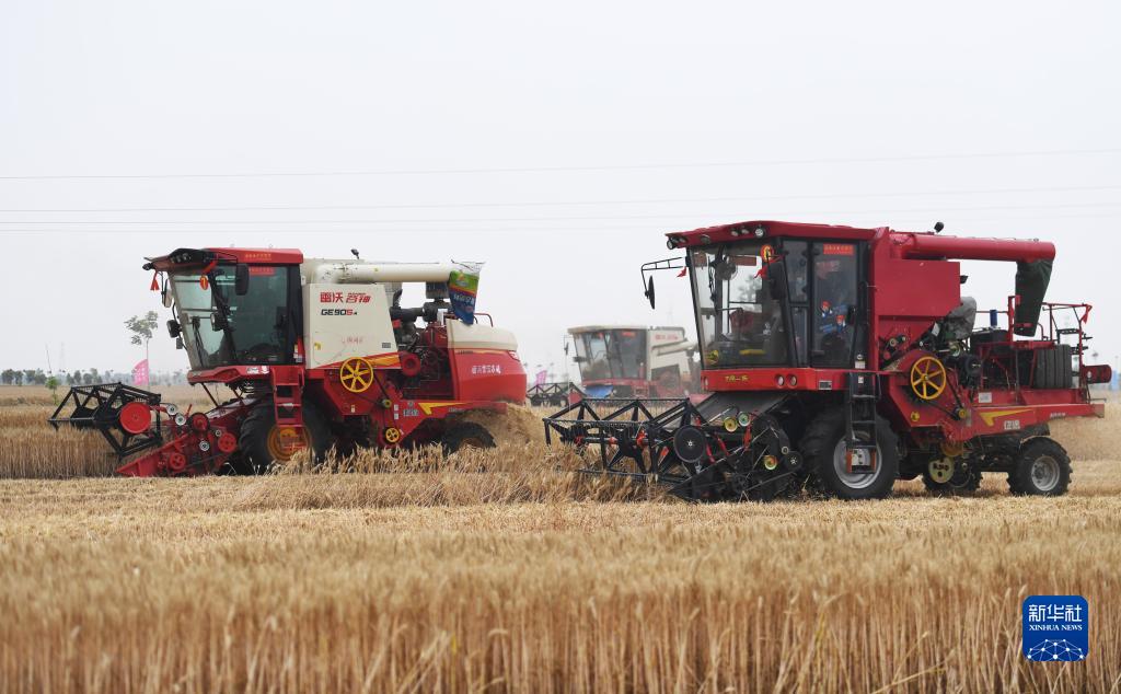 這是5月26日在河南省南陽(yáng)市唐河縣湖陽(yáng)鎮張灣村拍攝的小麥機收減損技能大比武現場(chǎng)。新華社記者 張浩然 攝