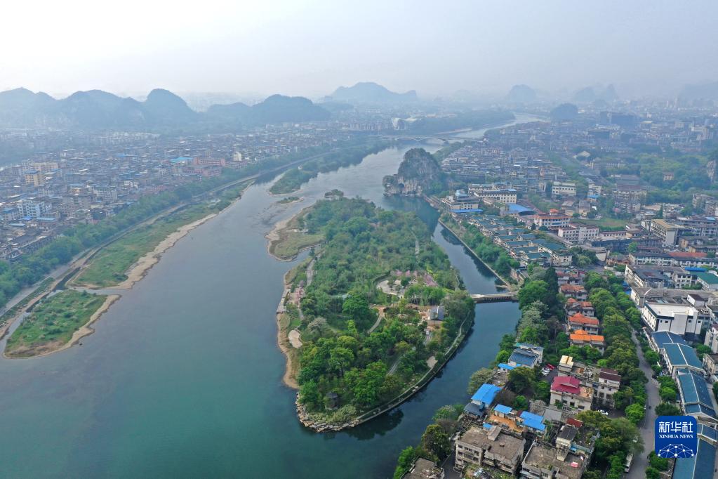 生態(tài)修復改造后的漓江伏龍洲景色(4月10日攝,無(wú)人機照片)。新華社記者 周華 攝