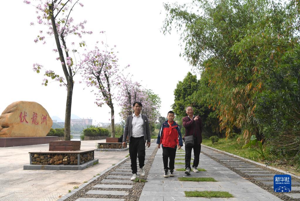 伏龍洲原居民黃崗(右)帶著(zhù)兒子、孫子重回改造后的伏龍洲游玩(4月10日攝)。新華社記者 周華 攝