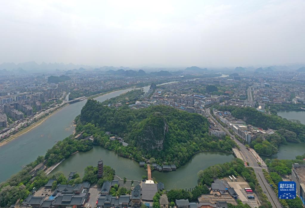漓江沿岸木龍湖及建設中的古宋城街區(4月10日攝,無(wú)人機照片)。新華社記者 周華 攝