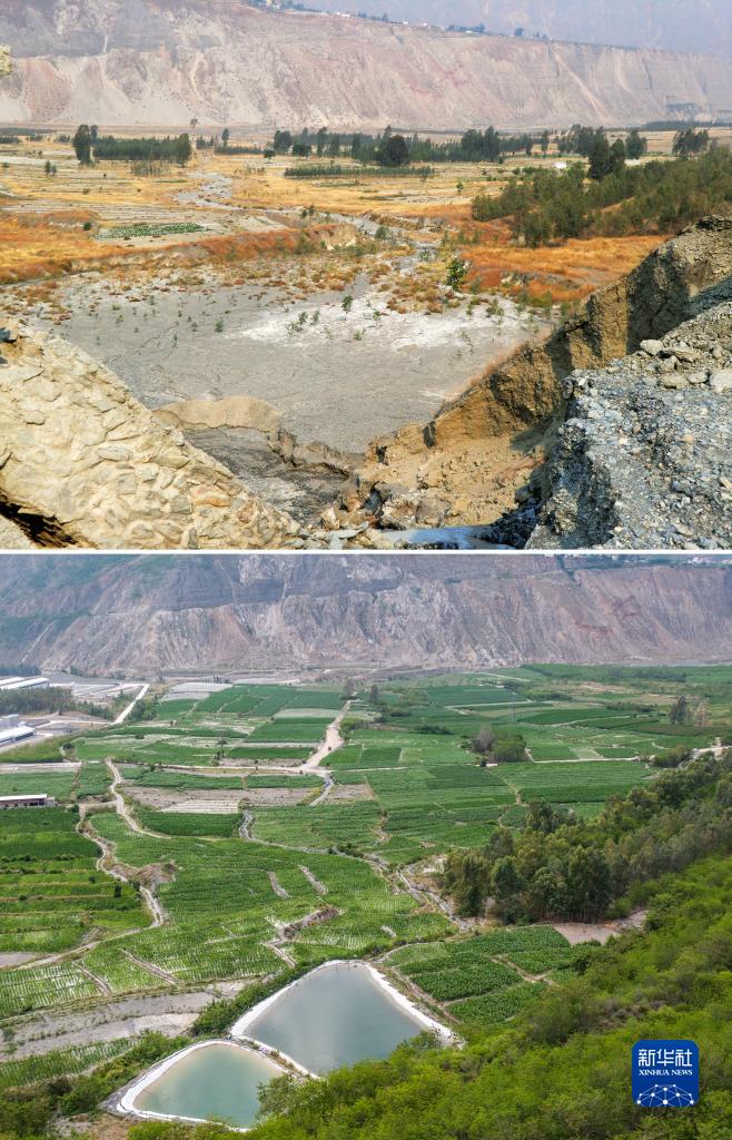 這是一張拼版照片,上圖為:2013年蔣家溝出口段附近發(fā)生泥石流后的景象(資料照片);下圖為:蔣家溝出口段附近生態(tài)修復治理后的景象(6月1日攝,無(wú)人機照片)。新華社記者 胡超 攝