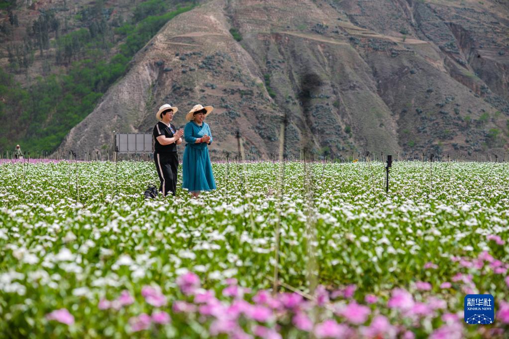 5月31日,游客在云南省昆明市東川區湯丹鎮小江四季花海參觀(guān)游玩。新華社記者 胡超 攝