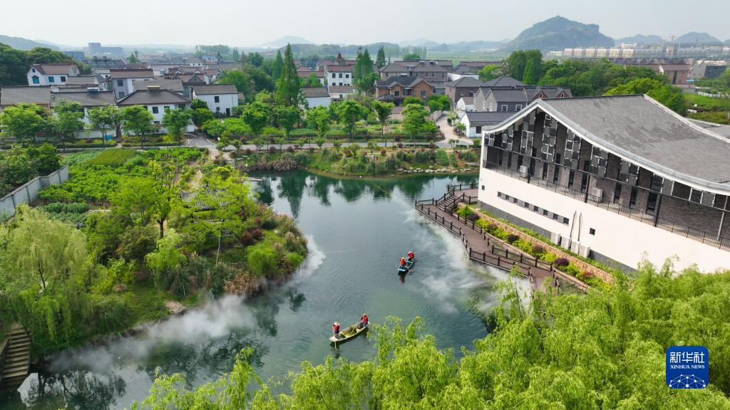 4月12日,在浙江省湖州市德清縣洛舍鎮東衡村,河道保潔員在進(jìn)行日常保潔(無(wú)人機照片)。新華社發(fā)(王正 攝)
