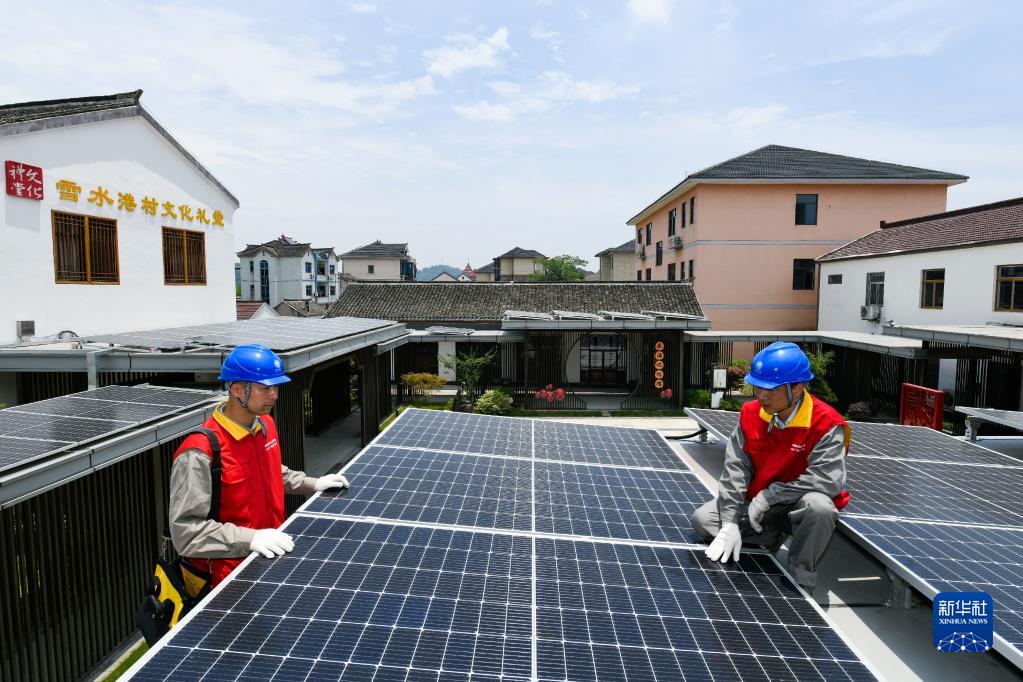 6月9日,電力工人在浙江省嘉興市海鹽縣通元鎮雪水港村文化禮堂的連廊上安裝光伏發(fā)電板。新華社發(fā)