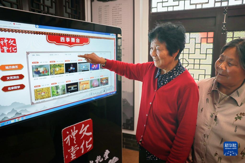6月13日,在浙江省紹興市越城區馬山街道尚巷村文化禮堂,村民使用智慧觸摸屏觀(guān)看戲曲視頻。新華社發(fā)(黃葉華 攝)