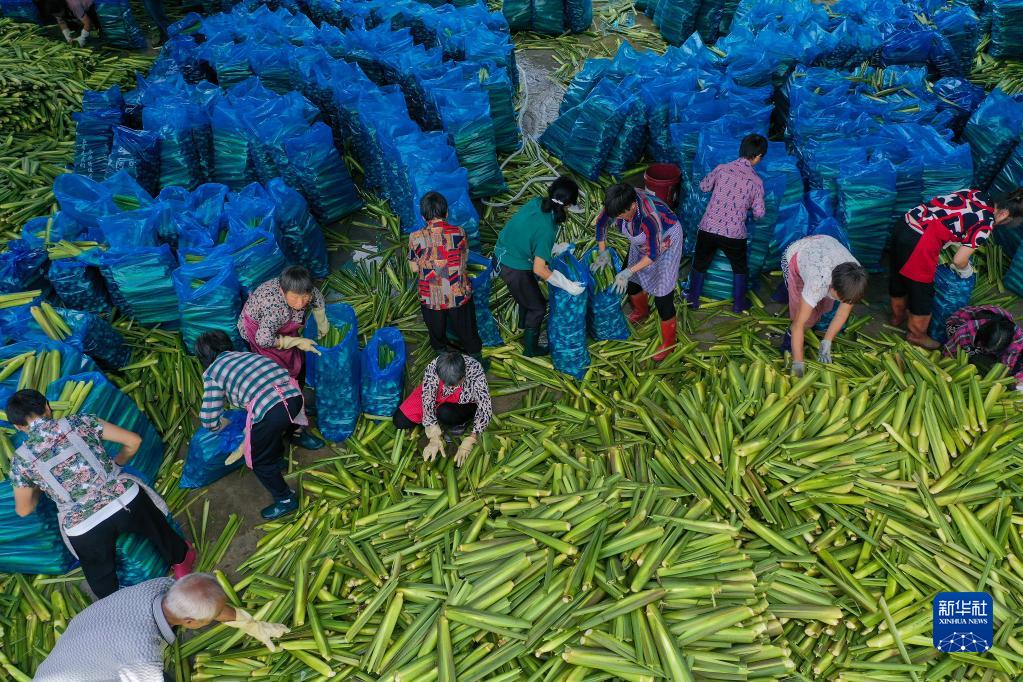 2021年8月25日,在浙江省麗水市景寧畬族自治縣大漈鄉大漈村茭白交易市場(chǎng),村民將新收割的茭白打包冷藏(無(wú)人機照片)。新華社發(fā)(李肅人 攝)