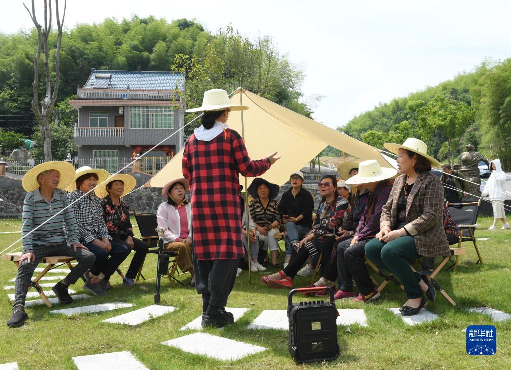 5月17日,在浙江省建德市航川村,“文藝村長(cháng)”周霞(中)指導村民們進(jìn)行聲樂(lè )練習。該市在各鎮街推行“文藝村長(cháng)”工作制度,將有意愿的文藝工作者分派到農村開(kāi)展教學(xué)。新華社記者 翁忻旸 攝
