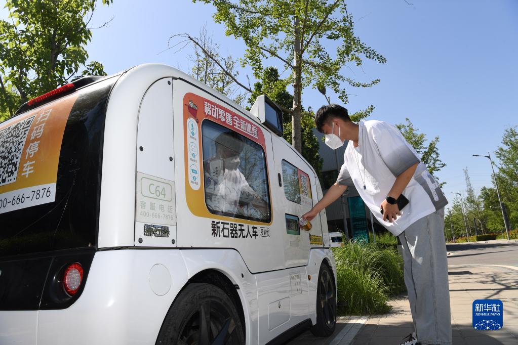 在雄安市民服務(wù)中心,市民在智能無(wú)人售賣(mài)車(chē)購買(mǎi)飲料(2022年5月27日攝)。新華社記者 朱旭東 攝