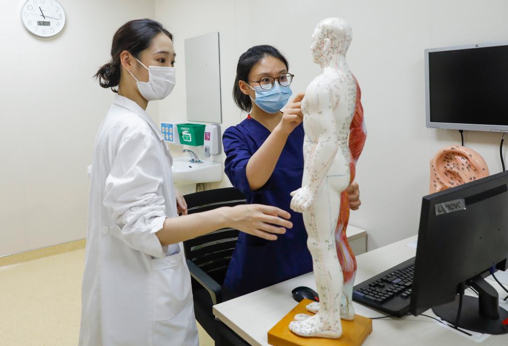 2022年6月30日,醫護人員在改造后的中國中醫科學(xué)院廣安門(mén)醫院急診科診室內查看針灸經(jīng)絡(luò )穴位人體模型。新華社記者 張玉薇 攝