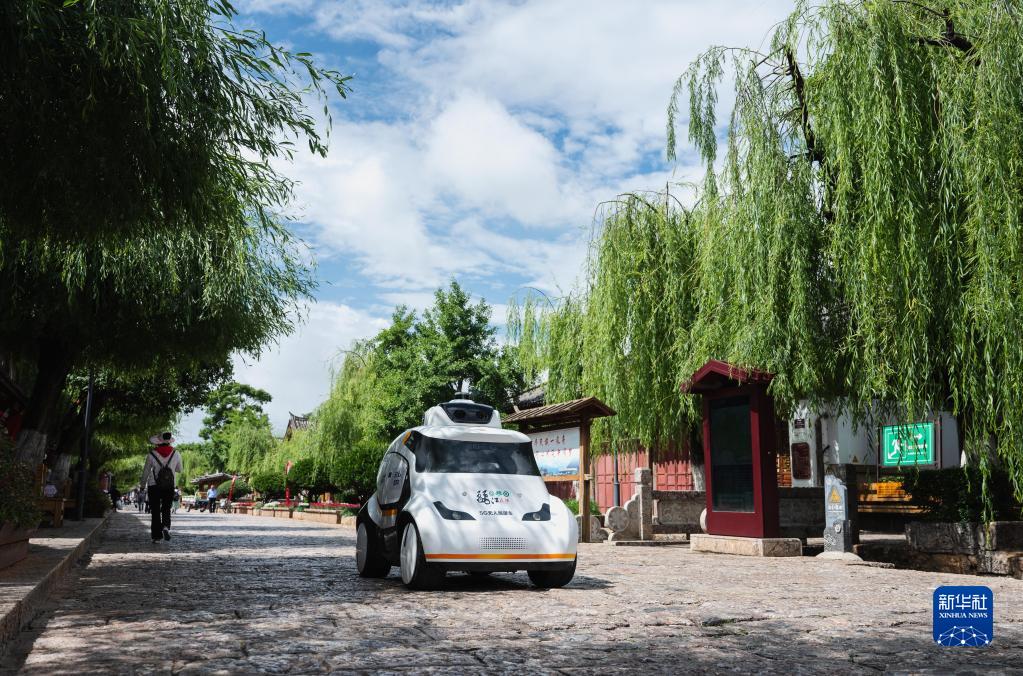 麗江古城5G無(wú)人巡邏車(chē)在進(jìn)行巡邏作業(yè)(2022年6月9日攝)。新華社記者 王冠森 攝