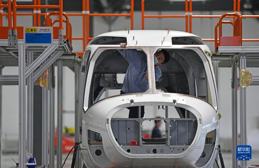在中國航空工業(yè)集團天津直升機有限責任公司車(chē)間內,工作人員在進(jìn)行AC332民用直升機的鉚接作業(yè)(2022年5月19日攝)。新華社記者 趙子碩 攝