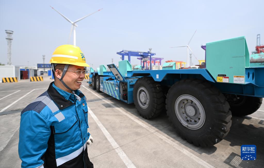 在天津港北疆港區C段智能化集裝箱碼頭,工人參觀(guān)“水平運輸機器人”(2022年4月29日攝)。新華社記者 李然 攝