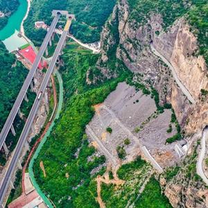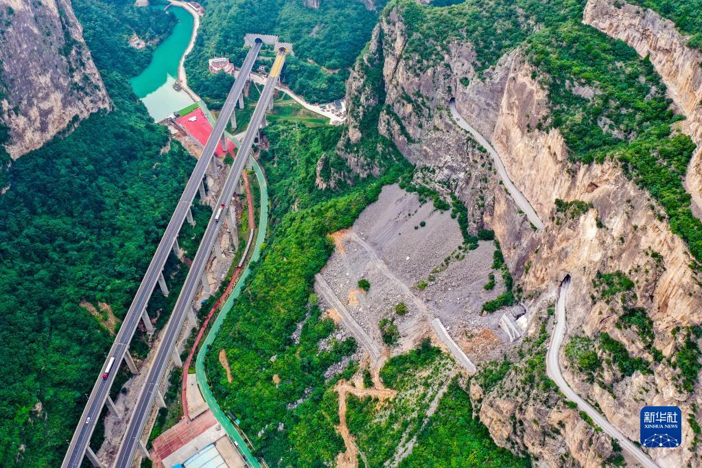這是通過(guò)山西省長(cháng)治市平順縣虹梯關(guān)鄉的高速公路(畫(huà)面左側),一旁是過(guò)去的“掛壁公路”(畫(huà)面右側)(2022年7月5日攝,無(wú)人機照片)。新華社記者 曹陽(yáng) 攝