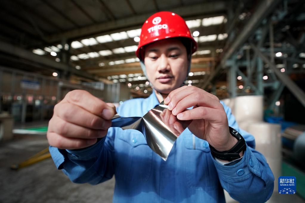 在中國寶武太鋼不銹鋼精密帶鋼有限公司,一名工作人員展示用手撕開(kāi)超薄精密不銹帶鋼(2022年3月31日攝)。新華社記者 詹彥 攝