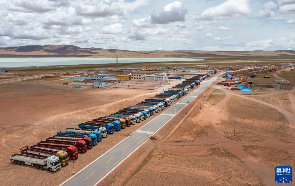 在雙湖縣多瑪鄉拍攝的負責運送搬遷群眾家具的貨車(chē)(7月12日攝,無(wú)人機照片)。新華社記者 孫非 攝
