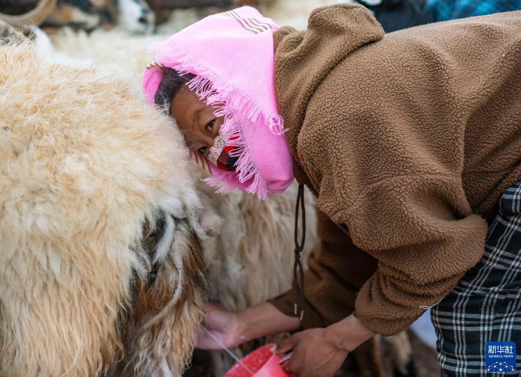 傍晚,男人們放牧歸來(lái),羊群被趕到圍欄邊,嘎瑪的外孫女石秀措姆加入了擠奶的隊伍。