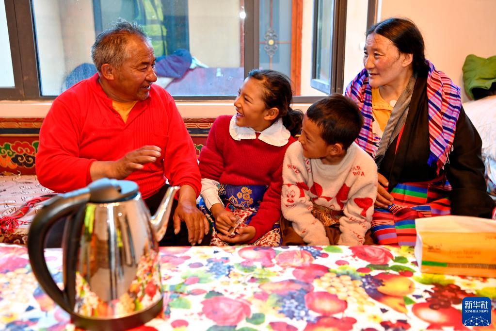 從雙湖縣多瑪鄉搬遷到森布日安置點(diǎn)新居的牧民索朗措加(左一)和妻子查格(右一),與孫女旦珍卓嘎(左二)和孫子歸桑桑旦一起聊天(7月19日攝)。新華社記者 張汝鋒 攝